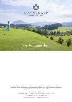 Dies ist ein Mehrzweckgutschein mit Einlöseempfehlung. Die Einlösung kann von der Empfehlung abweichen und ist im gesamten Sonnenalp Resort möglich. Weicht der tatsächliche Wert der Inanspruchnahme vom Gutscheinwert ab, so kann ein etwaiger Restbetrag für andere Leistungen in Anspruch genommen werden bzw. wird ein Aufpreis berechnet. Eine Auszahlung in bar ist nicht möglich. Dieser Gutschein hat eine Gültigkeit von drei Jahren, beginnend mit dem Schluss des Jahres, in dem der Gutschein ausgestellt wurde (Ausstellungsdatum). Es gelten die Allgemeinen Geschäftsbedingungen.
